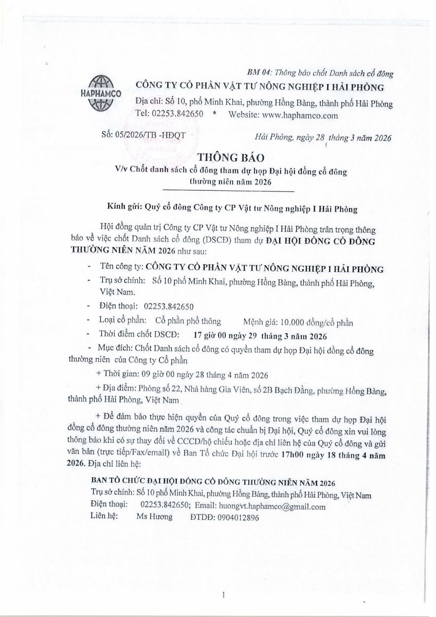 Thông báo chốt danh sách cổ đông tham dự họp Đại hội đồng cổ đông thường niên năm 2026