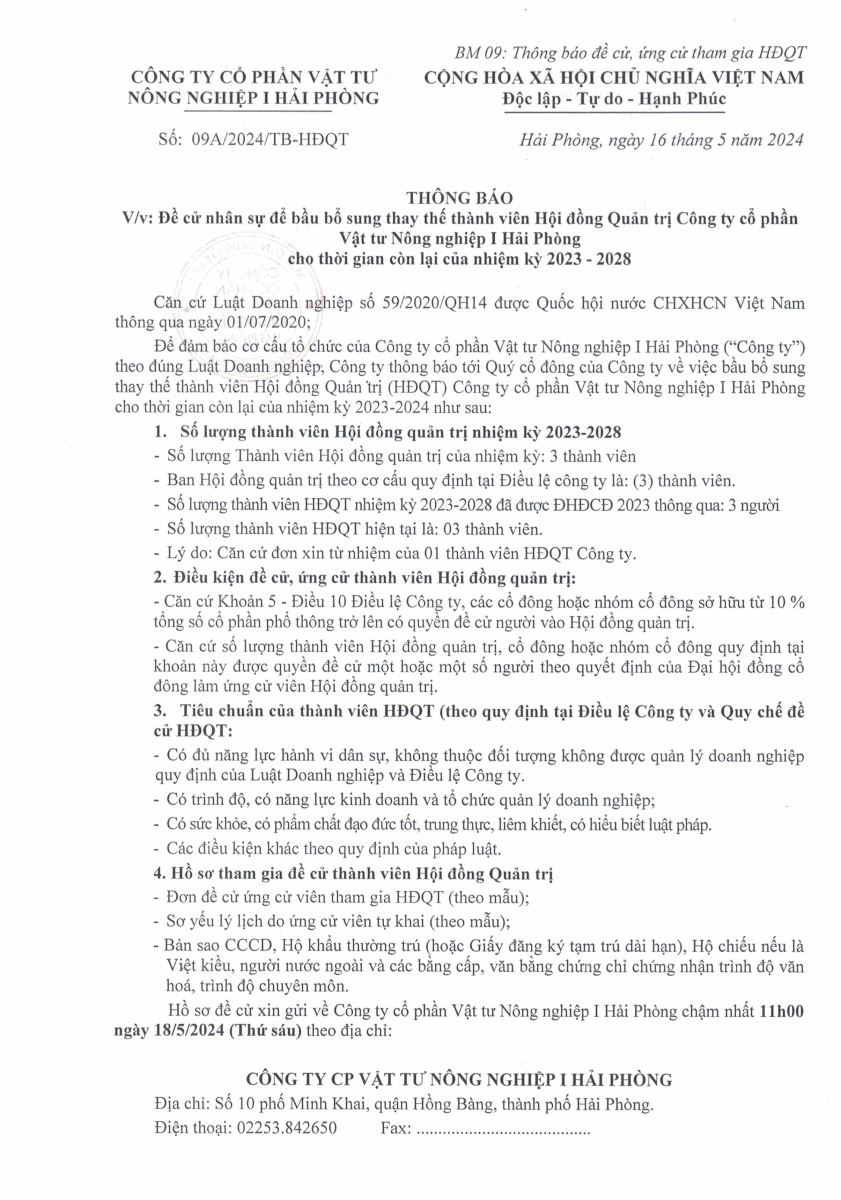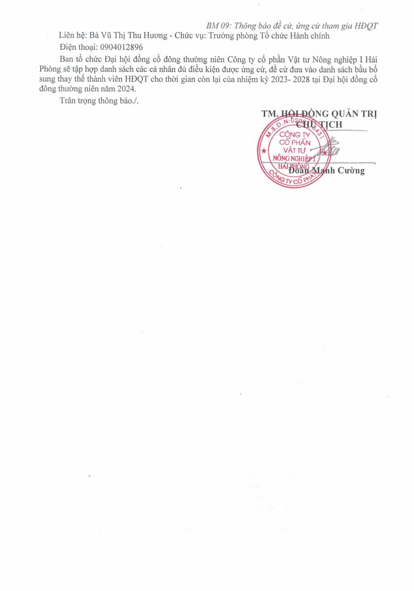 Thông báo đề cử nhân sự để bầu bổ sung thay thế thành viên Hội đồng quản trị Công ty Cổ phần Vật tư Nông nghiệp I Hải Phòng cho thời gian còn lại của nhiệm kỳ 2023-2028